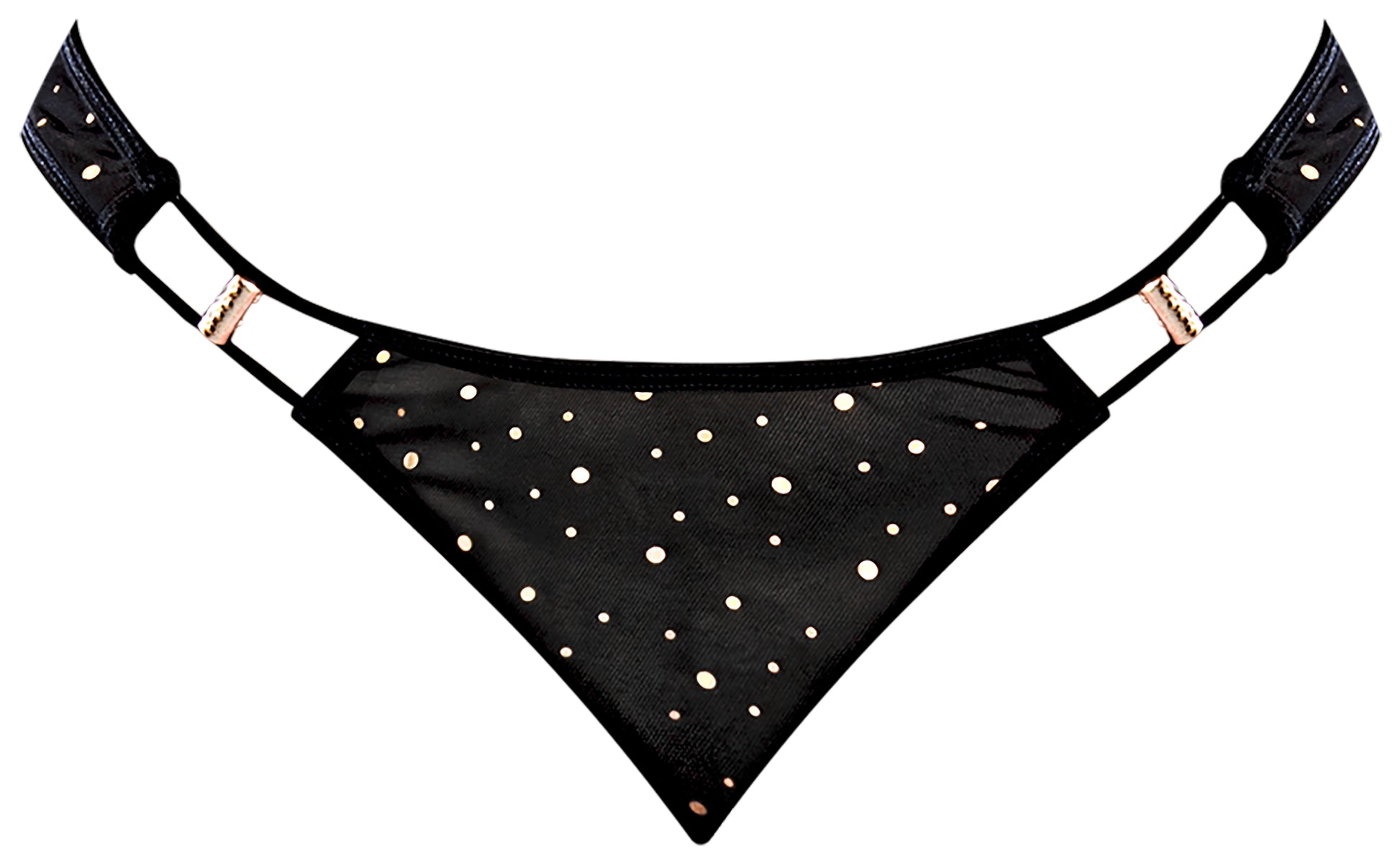 Glitz and Glam Tanga Black S/M from Magic Silk Lingerie. From the Exposed by Magic Silk collection, this style includes: a black mesh tanga with dotted gold sequins and gold beads connecting at the hips. Indulgent gold glittering sequins adorn a sheer black mesh fabric, fitted to the body. Intricate strapping is stretchy and decorated with decadent gold beads. Fabric content: 90% Polyester, 10% Spandex. Care: hand wash cold water. No Bleach. Dry flat. The tanga is a revealing underwear item which leaves little to the imagination. A small triangle of fabric in the front reveals the tummy and a strap that connects to the back exposes most of your buttocks and hips. This super sexy shape shows of your feminine curves. Ladies sizes small to medium fits women dress sizes 4 to 10. Categories: Lingerie, Clothing, Women's Underwear, Naughty Role Play. 2023.