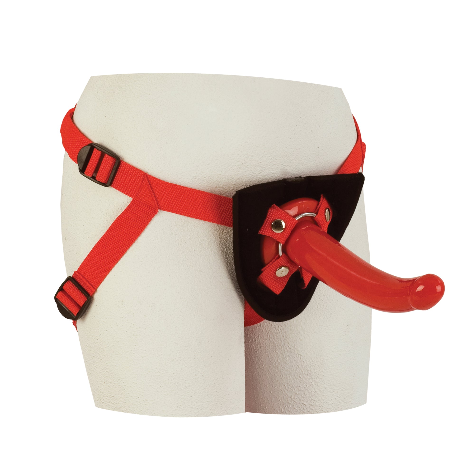 The Sophia's Red Rider is a durable universal harness, and it's padded for extra comfort. The sturdy and pliable slim G-curved dong is removable. The waist and thigh straps are fully adjustable - the waist straps adjust up to 60" and the thigh straps up to 30". Harness accomodates most probes. Made with PVC (dong), PP (harness), PE (padding), Chrome plated iron (ring), and Nickel plated iron (s naps).